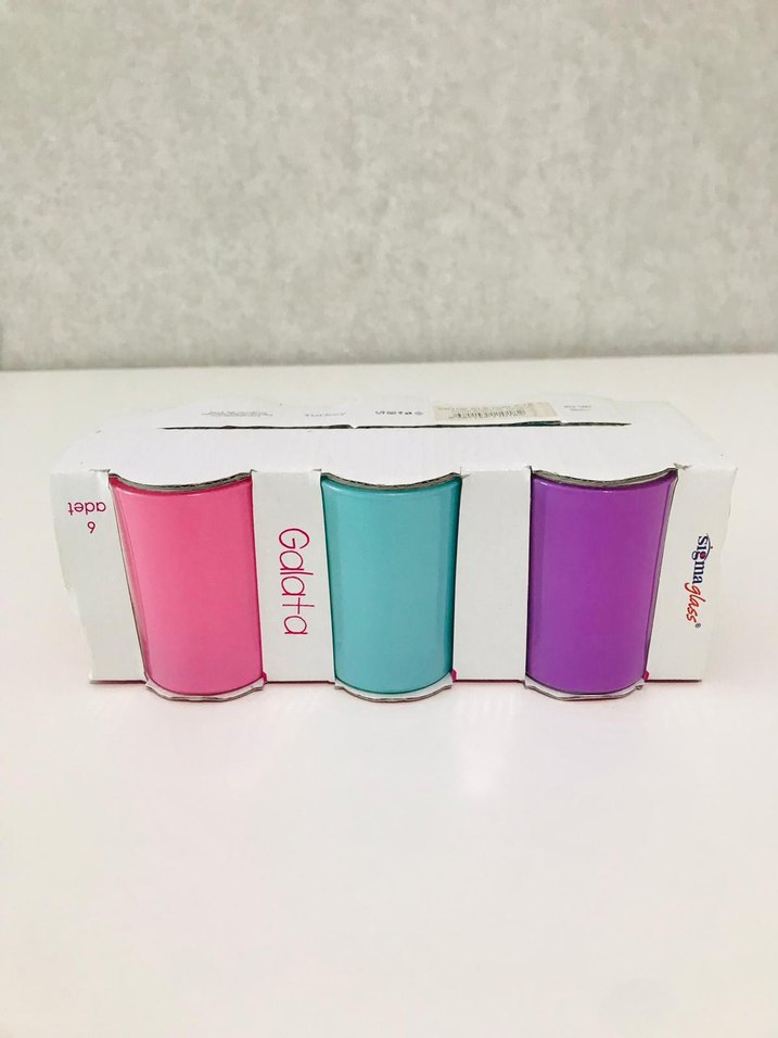 Galata tasarımlı Sigmaglass markasına ait pembe, turkuaz ve mor pastel renklerde 6'lı cam bardak seti. Günlük kullanım için uygundur.