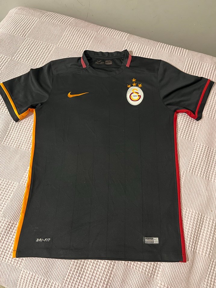 Siyah renkte, kısa kollu, bisiklet yaka ve dar kesim Galatasaray forması. Sentetik kumaştan, baskılı detaylı ve cırt cırtlı özellikli, spor ve günlük kullanım için uygun.