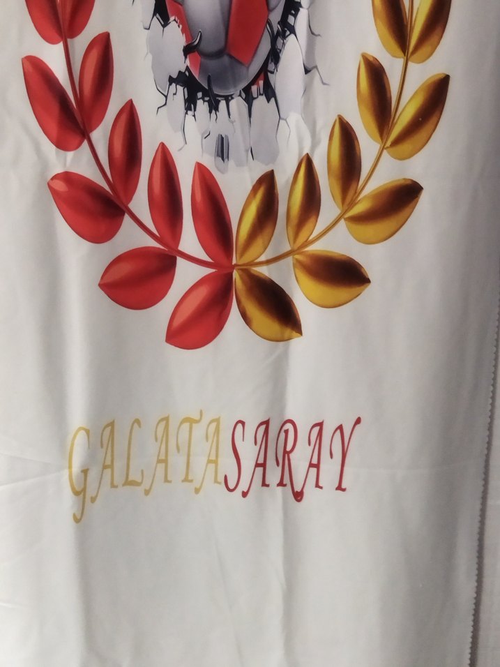 Altın renkli, üzerinde 'GALATASARAY' yazan minimalist ve bohem tarzda erkek tek kanat fon perde Hafif canlı tonları ile retro bir görünüm sunar.