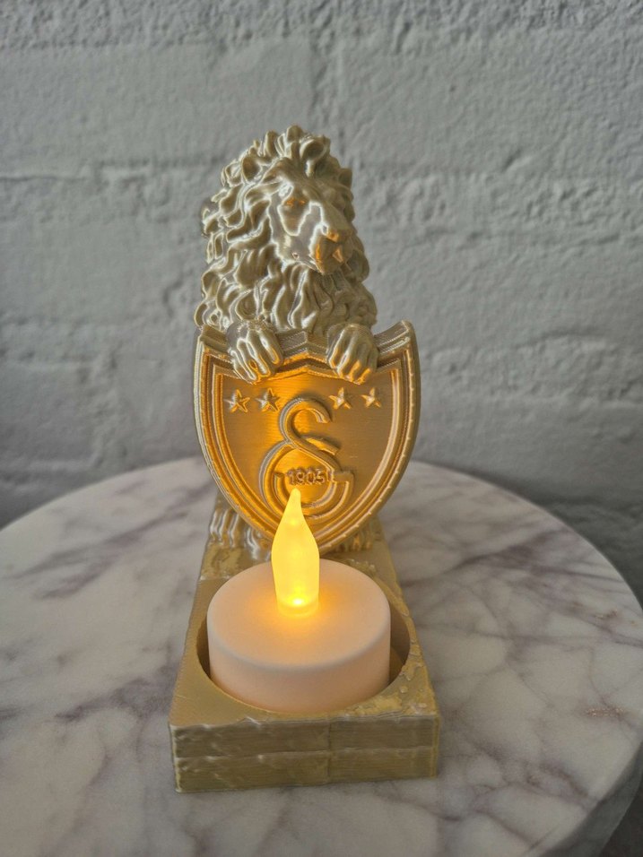 galatasaray armalı Altın renginde, kalkan tutan aslan figürlü, ışıklı mumluk. Kalkan üzerinde yıldızlar ve logo detayı bulunur. özel şiparişleriniz için ulaşabilirsiniz