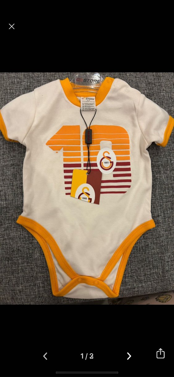 Kısa kollu, bisiklet yaka bebek body, Galatasaray baskılı ve çıtçıtlı. Yumuşak, sıcak kumaştan açık kahverengi tonlarında.