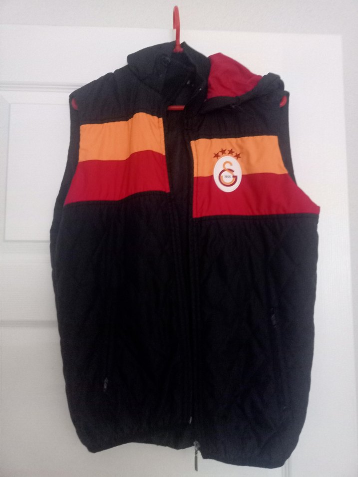 Kırmızı ve turuncu şeritli, önü fermuarlı siyah yelek. Galatasaray logosu, kapüşonlu ve atletik tarzda sportif kullanıma uygun..orjinal