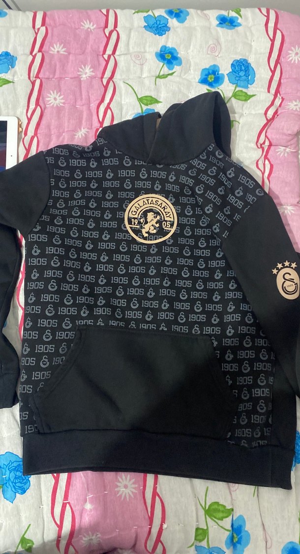 Düğmeli, baskılı desenli, siyah renkli, uzun kollu, bisiklet yaka, Galatasaray temalı erkek sweatshirt. Yumuşak ve sıcak kumaştan, fit kesim.