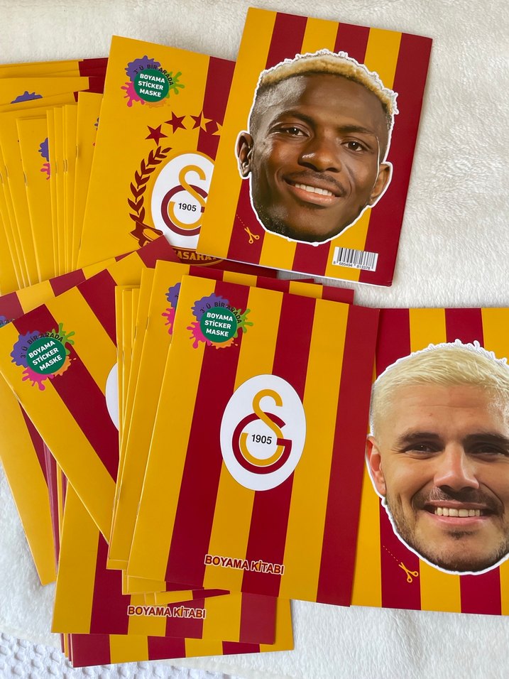 Galatasaray renkleri ve oyuncu yüzleriyle boyama kitabı, sticker maskelerle eğlenceyi artırır. Futbolseverler için ideal. ⚽ #gs #galatasaray #aslan #ıcardi #ossimen #krampon