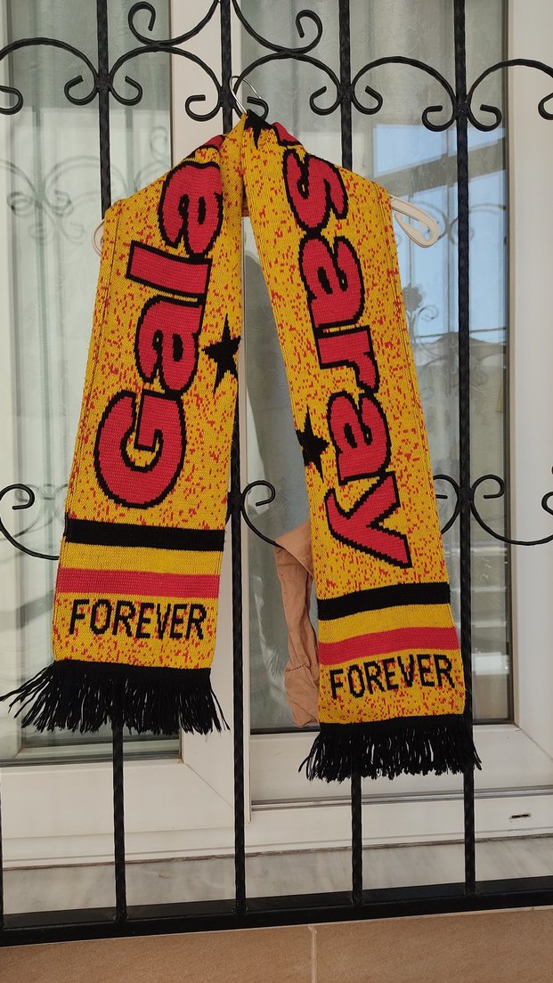 Uzun sarı kırmızı atkı, büyük baskılı yazılar ve püsküllü uçlarla. "FOREVER" yazısı bulunur.sorunsu çok çok az tüylenme var