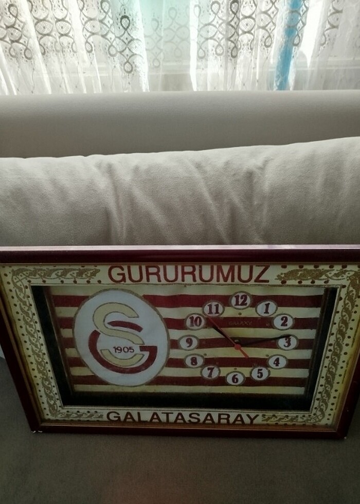 Galatasaray temalı duvar saati. Pil takıp denedim ama çalışmadı. Tamir edilir mi onu da bilmiyorum.Hiç tamir etmeyi yanda ettirmeyi denemedim. Fanatiği süs olarak bile kullanabilir .