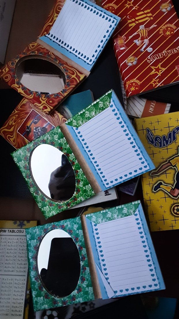 Çizgili sayfalı ve yuvarlak aynalı, çeşitli renkli kapak desenlerine sahip defterler.