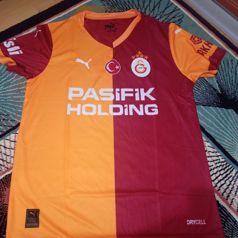 Sentetik kumaştan, kısa kollu ve bisiklet yakalı, dar kesim erkek spor forması. Parlak kırmızı-sarı baskılı, spor ve sokak stili için uygun. 'DRYCEL, HOLDING, PASiFIK' yazıları bulunur. ⚽