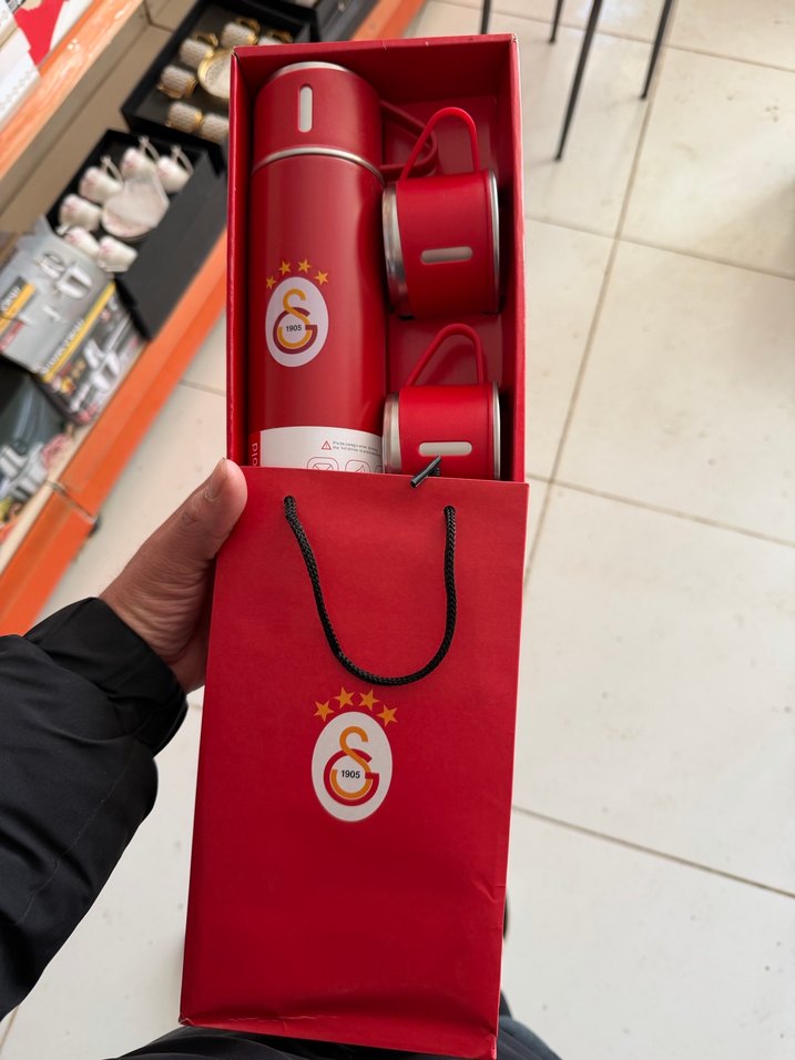Galatasaray logosu bulunan kırmızı termos seti, iki uyumlu bardak içerir ve içecekleri sıcak tutar. Bardaklı