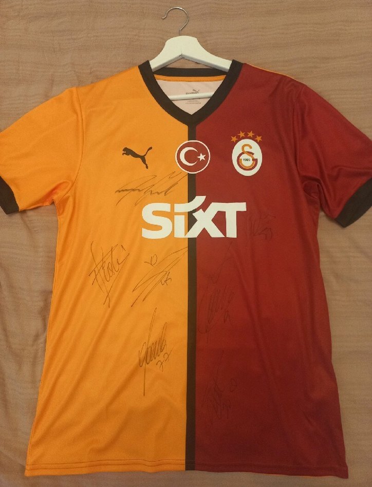 Parlak kırmızı ve sarı baskılı, kısa kollu, yuvarlak yakalı, bol kesim, ipeksi kumaştan erkek forma. Önünde Sixt logosu ve imzalar bulunur. ⚽