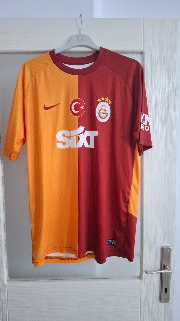 Kısa kollu, yuvarlak yakalı erkek forma. Sentetik kumaştan, salaş kesim ve drapeli. Koyu kırmızı-turuncu tie-dye desenli, Galatasaray amblemli ⚽️ BEDEN :XL