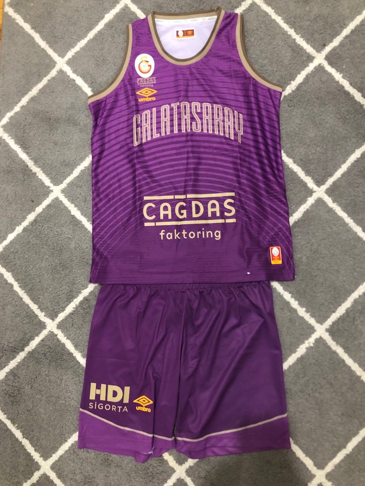 Mor renkli Galatasaray atlet ve şort takımı, bol kesim ve baskılı desenlidir. Dantel detayları ve CAGDAS, HDI Sigorta sponsor logoları bulunur, spor ve sokak stili için uygundur.