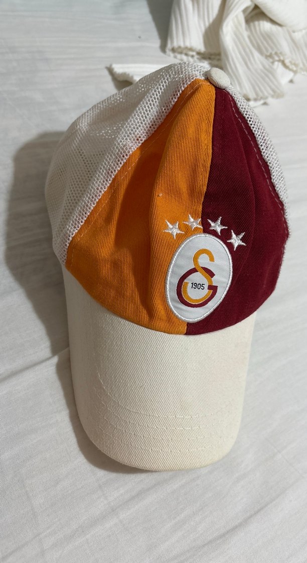 Beyaz file arka ve önünde turuncu ile bordo panellerin bulunduğu, Galatasaray logosu nakışlı erkek şapka. Rahat ve sportif tarzı yansıtır.