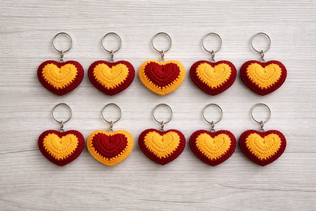 Renkli kırmızı ve sarı tonlarda, örgü kalp şeklinde anahtarlıklar. Rahat ve bohem tarzda, retro bir görünüm sunar. tek fiyatı, 100 tl toplu alımda 85 tl