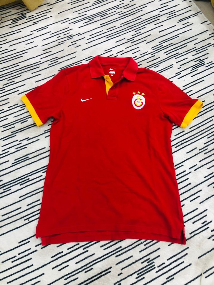 Kısa kollu, düğmeli yakalı erkek tişörtü. Sentetik kumaştan, kırmızı renkli, sarı kol manşetli ve baskılı logo detaylı. Spor ve günlük kullanım için uygun. ⚽