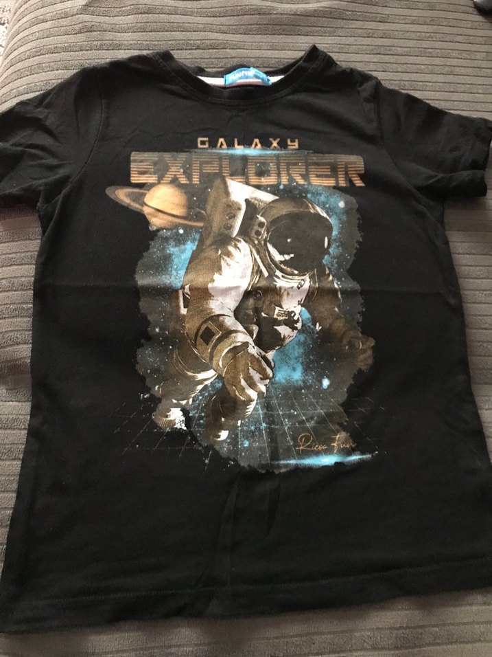 Kısa kollu, bisiklet yaka, siyah uzay astronot sevenler için. Önünde galaksi temalı baskı bulunur. 6-7 yaş özdilek markası yepyenidir