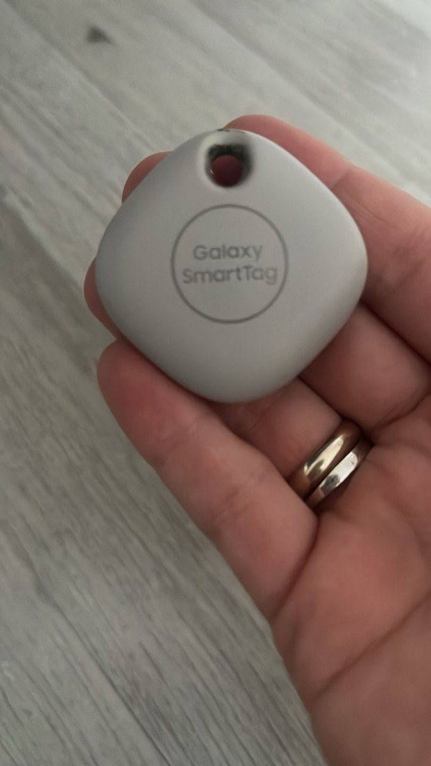 Galaxy SmartTag, beyaz renkli, küçük boyutta ve eşyalarınızı bulmanızı kolaylaştıran bir akıllı takip cihazıdır.