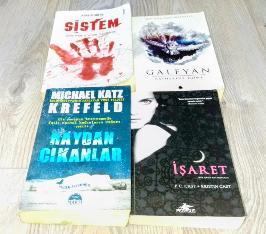 ortlama tane fiyatidir Kanlı el izi kapaklı "Sistem", mistik kuşlu "Galeyan", Michael Katz imzalı mavi kapaklı "Krefeld" ve karanlık tasarımlı "İşaret" romanları.