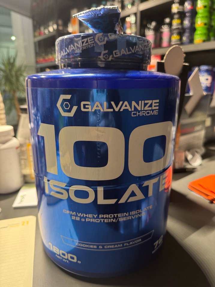 Galvanize Chrome 100 Isolate, parıldayan mavi renkli, porsiyonda 22g protein içeren 1800g ağırlığında kurabiye ve krema aromalı protein tozudur.