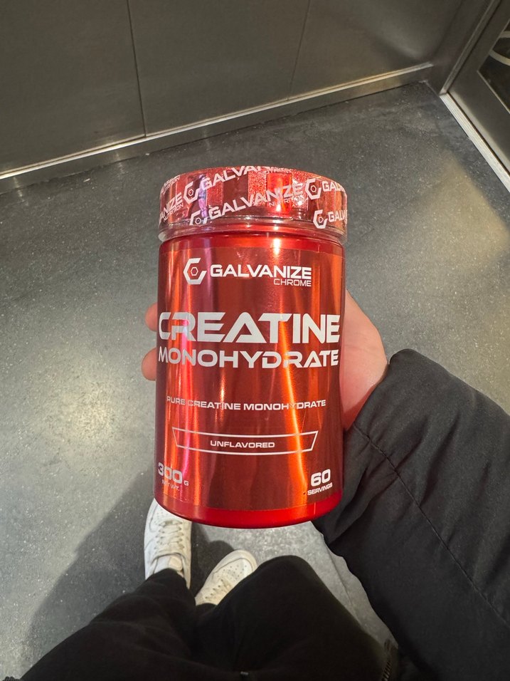 Galvanize markalı 300g unflavored kreatin monohidrat tozu, parlak turuncu ambalajda, 60 porsiyon. Kas enerjisi ve toparlanma için uygundur. ️♂️