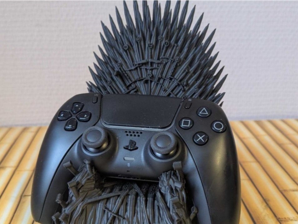 Game of Thrones Demir Taht tasarımlı, detaylı siyah malzemeden yapılmış PlayStation 5 kumanda tutucu.