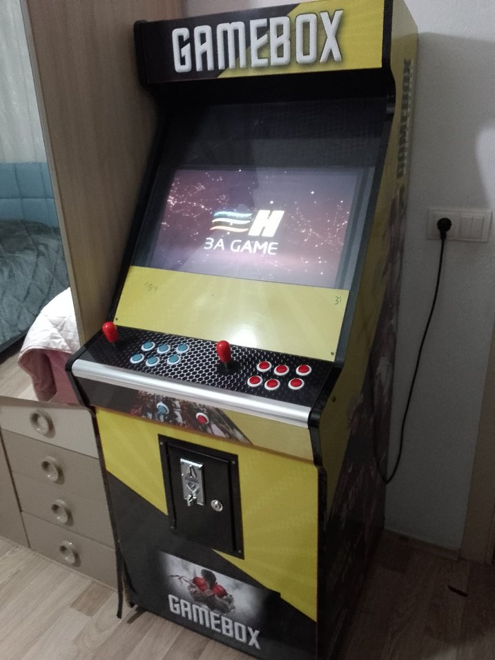 GAMEBOX arcade makinesi, çift joystick ve çoklu tuşlarla klasik oyun deneyimi sunar. Retro tasarımı ve para giriş yuvası bulunur.