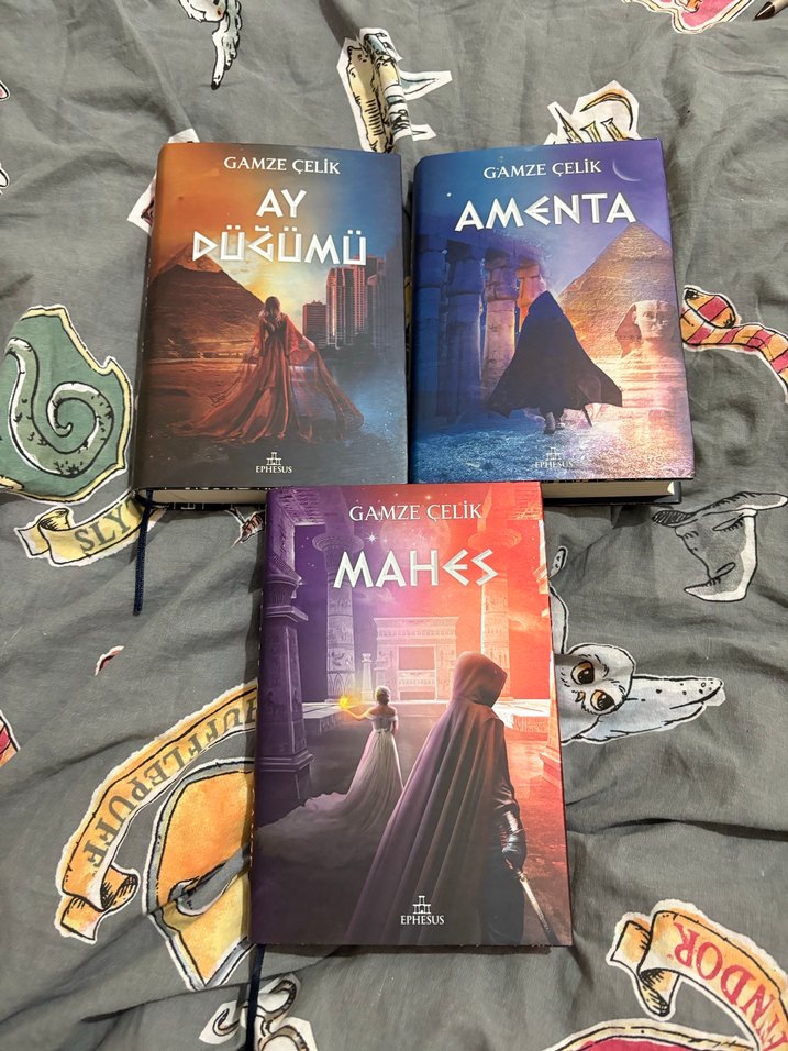 Gamze Çelik'in Ay Düğümü , Mahes ve Amenta romanlarından oluşan set. Her kitap farklı ve etkileyici kapak görsellerine sahip. Alti çizili yerler var 3 lü fiyat