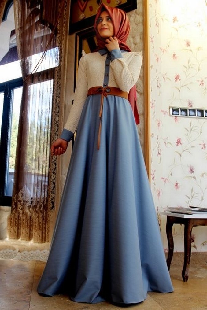 Özel tasarım Dantel detaylı, yakalı uzun kollu bohem elbise. Bej dantel ve gri pamuk kumaş kombinli, nakışlı