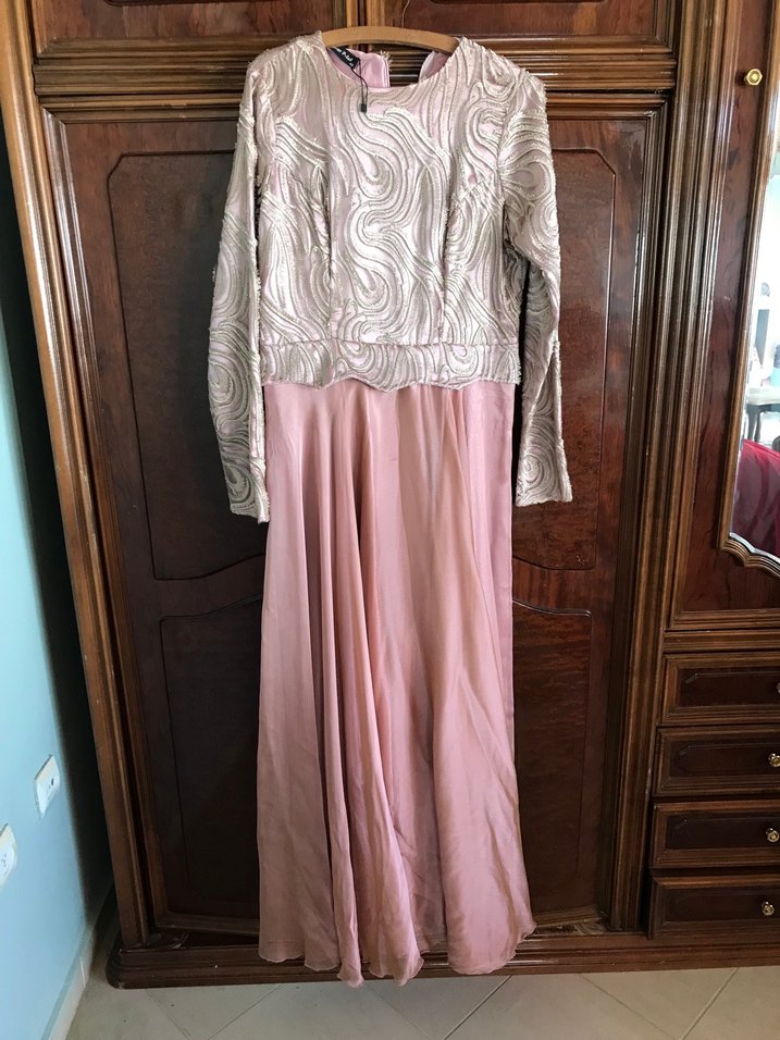 Gamze Polat üst kısmı altın sırmalı kumaş, alt kısmı iç saten dış şifon kumaş olan 42 beden alınmış kullanılmamış tesettür abiye elbise