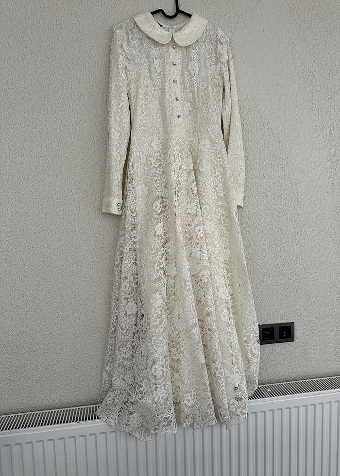 1 defa kullanıldı özel gün serisinden özel dikim kupürlü inci detaylı kollarında inci düğmeler mevcut polo yaka komple kollar dahil astarlı rahat bir elbise ekru beyaz Ölçüler: Kol manşet dahil 60 cm Manşet 5 cm (2 inci düğmeli) Elbise etek genişliği 1.86 cm Elbise boy 1.40 cm Elbise astar boy 1.33 cm Elbise üst gövde 41 cm (5 inci düğmeli) Elbisenin yakası 7 cm Arkada gizli Fermuar 43 cm