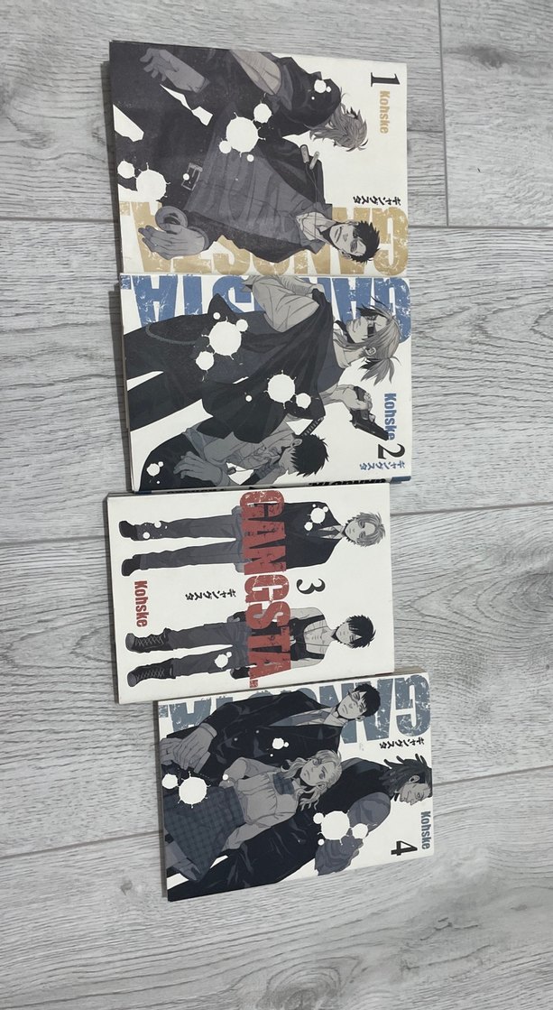 Gangsta manga serisi 1'den 4'e kadar dört cilt, karakterlerin siyah beyaz kapak çizimleriyle.