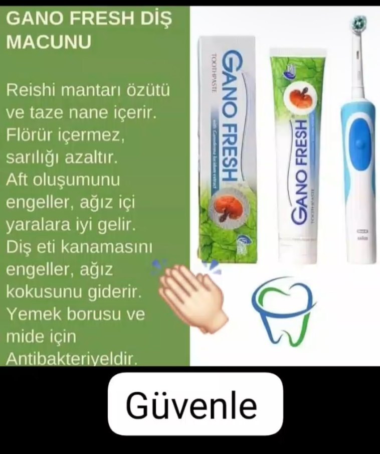 Gano Fresh diş macunu,Ganoderma mantarı özü ve taze nane içerir. Kötü nefesi azaltır, diş eti kanamasını önler ve bakteri oluşumunu engeller. Florür içermez.