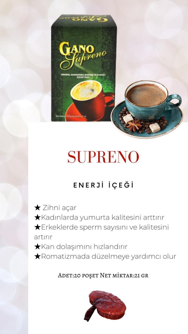 Gano Supreno enerji içeceği zihni açar, kadınlarda yumurta kalitesini ve erkeklerde sperm sayısını artırır. Kan dolaşımını hızlandırır, romatizmada yardımcı olur. 20 poşet, 21 gram.
