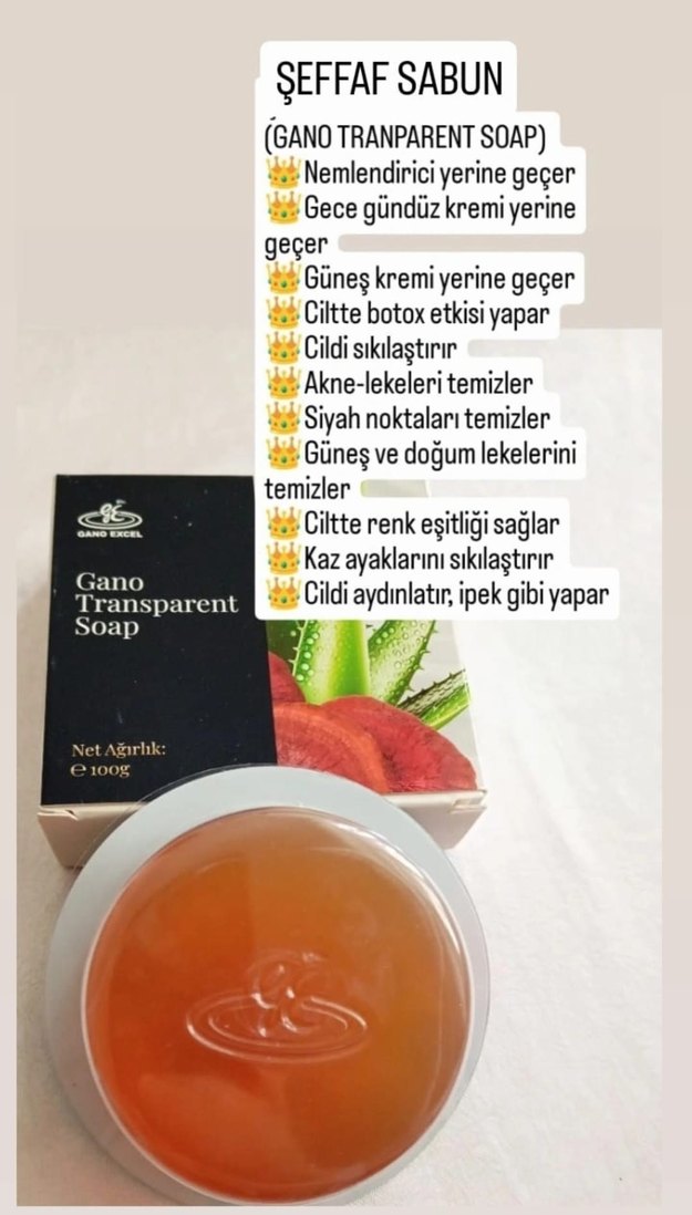 Gano Transparent Soap, akne ve siyah noktaları temizler, cildi nemlendirir. Cilt tonunu eşitler, kırışıklıkları sıkılaştırır ve cildi ipek gibi aydınlatır. Gece ve gündüz kremi yerine geçer. Güneş ve doğum lekelerine karşı etkilidir. Net ağırlık: 100g.