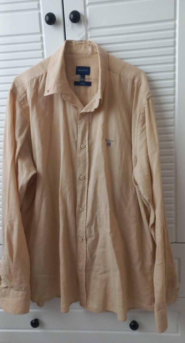 Bej renkli keten kumaştan yapılan Gant erkek gömleği, uzun kollu ve yakalıdır. Düğmeli ve normal kesimdir, rahat ve şık bir görünüm sunar. Ürün bir kere kullanıldı tertemiz. orijinal gant