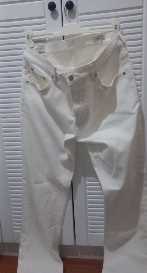 Beyaz, düz renkli, düğmeli erkek pantolon. Normal boy ve regular fit, sentetik yumuşak kumaştan, gündelik ve sokak tarzına uygun. Ürün sıfır. orijinal gant olculeri boy 116 paça genişliği 19 bel 50