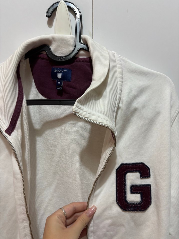 Beyaz pamuklu, fermuarlı, uzun kollu kadın ceket.