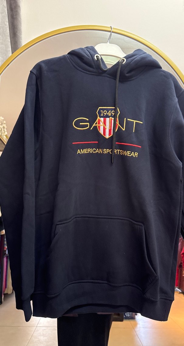 GANT markalı, kapüşonlu, uzun kollu, bol kesim erkek sweatshirt. Yumuşak ve sıcak kumaştan, koyu renkli, altın detaylı baskılı tasarım. Önünde '1949 GANT' ve 'American Sportswear' yazısı bulunur.