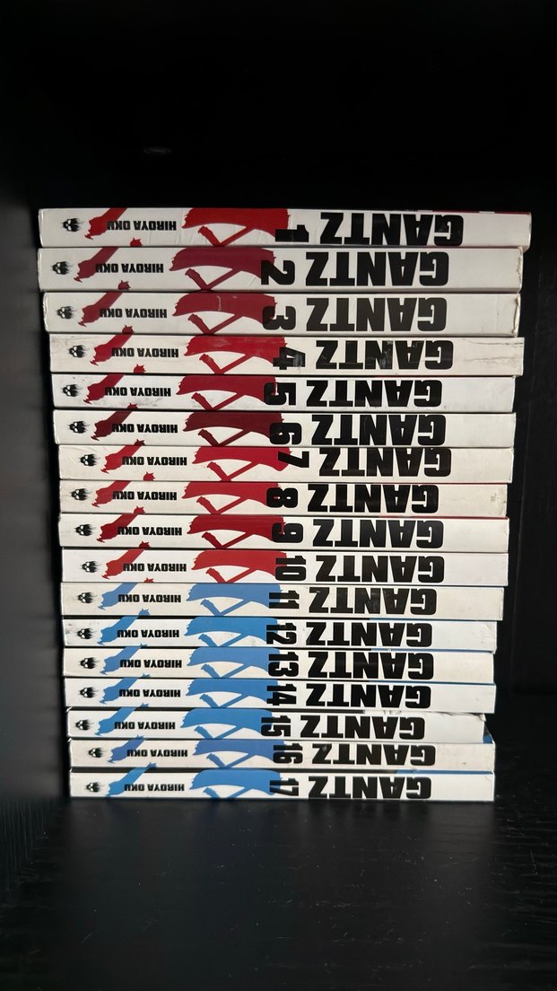 Hiroya Oku'nun Gantz mangasının 1'den 17'ye kadar tam seti, kırmızı ve mavi sırt tasarımlarına sahip.