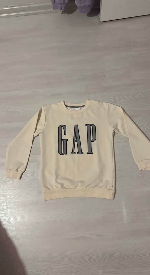 Bej renkli, uzun kollu ve bol kesim unisex sweatshirt. Gri GAP baskısı ve yumuşak fleece kumaş ile rahat sokak stili için uygun.