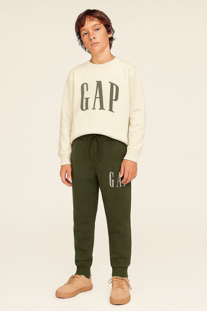Yumuşak fleece kumaştan yapılmış, beyaz baskılı GAP sweatshirt ve haki renkli, fermuarlı cepli bol kesim eşofman altı seti. Rahat ve şık sokak stili için ideal. 5-6 yas