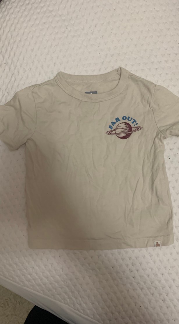 Bej renk, kısa kollu, yuvarlak yaka ve bol kesim erkek çocuk tişörtü. Yumuşak pamuklu kumaştan, "Far Out" yazılı gezegen baskısı ile rahat sokak stili sunar.