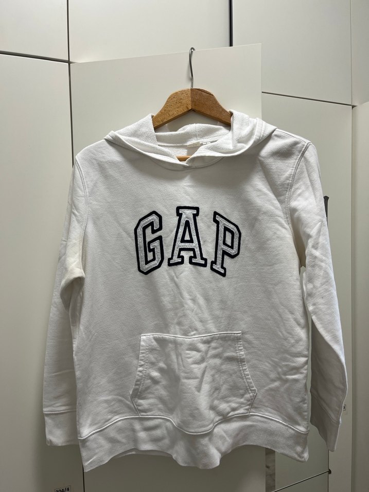 Beyaz GAP sweatshirt, kapüşonlu ve uzun kollu, bol kesim ve baskılı logolu. Yumuşak kumaştan, fermuarlı detaylı, günlük kullanıma uygun.