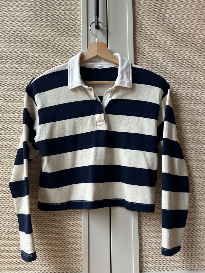 Pamuklu, çizgili, düğmeli ve uzun kollu kadın kazak. Salaş kesimi ve yakalı tasarımıyla günlük rahat kullanıma uygundur.