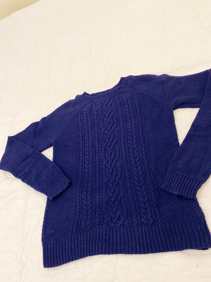 çocuklar için lacivert yün kazak, uzun kollu ve yuvarlak yakalıdır. Örgü dokusu yumuşak ve desensizdir. Günlük kullanıma uygundur.