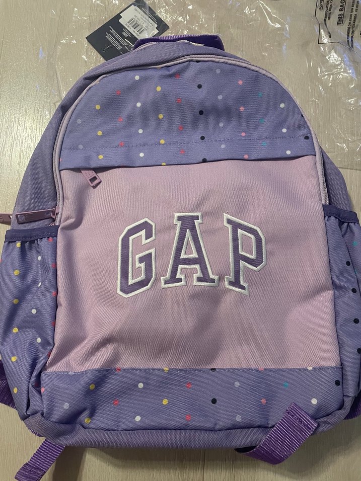 Pastel mor renkte, GAP logosu bulunan çocuk okul çantası. Çoklu bölmeleri, yan cepleri ve renkli nokta desenleri vardır.