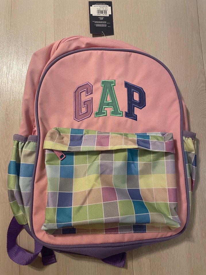 Pastel pembe renkli çocuk sırt çantası, renkli kareli ön cep ve GAP logosu ile tasarlanmıştır. Yan cepleri ve ayarlanabilir askıları vardır.