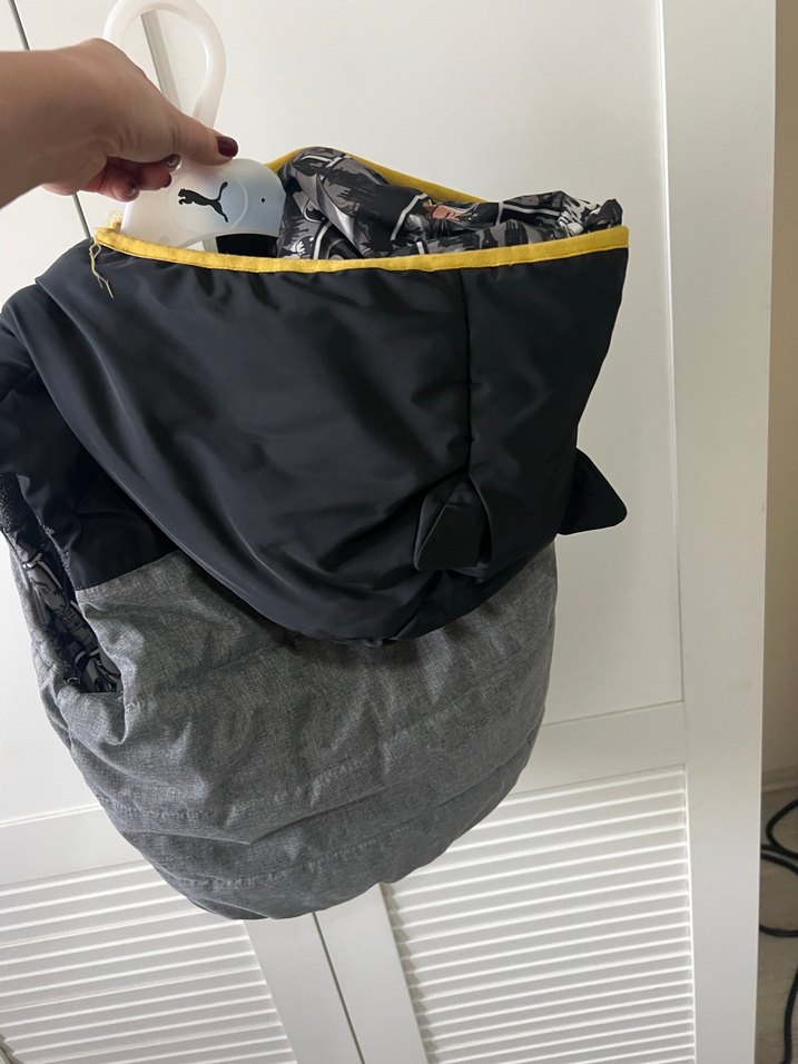 Yumuşak kumaş dış yüzeyli, geniş iç hacimli gri bebek yelek . Siyah kapüşonunda sarı şerit bulunur.