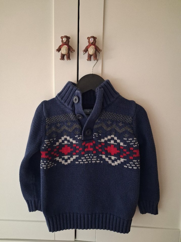 Yüksek yakalı, düğmeli, uzun kollu ve bol kesim erkek çocuk örgü kazak. Mavi ve gri tonlarında, göğüs kısmında ince desen bulunur.