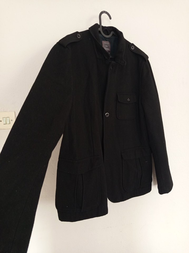 Erkekler için siyah düğmeli ceket, kesik yaka ve uzun kollu. Normal kesim, midi boy ve yumuşak, sıcak kumaştan üretilmiştir. Ofis ve sokak stili için uygundur.
